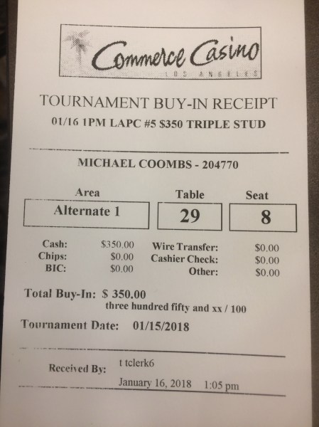 My plan is to play the $350 Stud 8 or Better tournament today and play a long session of $20/$40 LHE if I don’t make a super deep run. I fly out of LAX at 8 AM Friday so I’m skipping the Thursday tournament. I’m going to play cash deep into the night Wednesday, sleep in Thursday, hang out with my cousin and her husband Thursday evening and then head back to Hollywood Park Casino for an all night cash game session so I can play poker next to the airport and not have to wake up super early and fight through rush hour traffic to catch my flight.