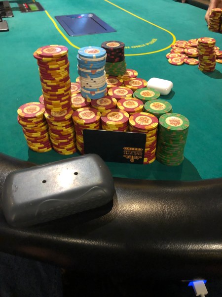 The turn is a 3, immediately pairing the board and hopefully giving me a lock winner. I say hopefully because this crowd is certainly capable of punting with bottom set in this spot and if you follow my blog you know I’ve taken that beat before. Fortunately, no one has quads and my hand holds up to win everything. One of the players flashed a set of queens, but I didn’t see what anyone else had.