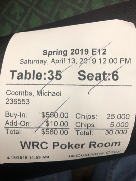 And just now, someone “trapped” me with 99 and limp-jammed on my raise. I had AK and snap called, flopped the nut flush draw and two overs and now I’m checking out of the hotel to get the fuck out of here.