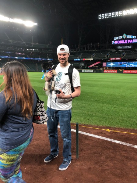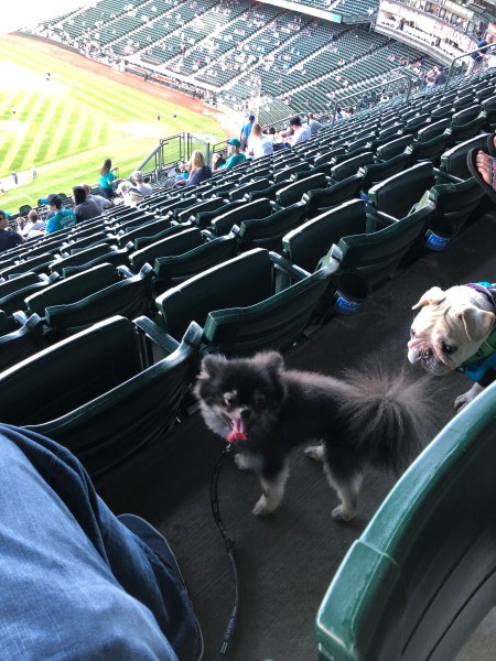 On Monday, Ducky and I met my niece at T-Mobile Park so Albus could enjoy Bark at the Park night and watch a Mariners game. I couldn’t believe how good he was! He seemed to really enjoy himself, hardly ever barked, and didn’t use the bathroom in the stadium at all – although if he popped a squat in the third base area as an “F U” to Kyle Seager when we got to walk around the field, I would have been okay with that.