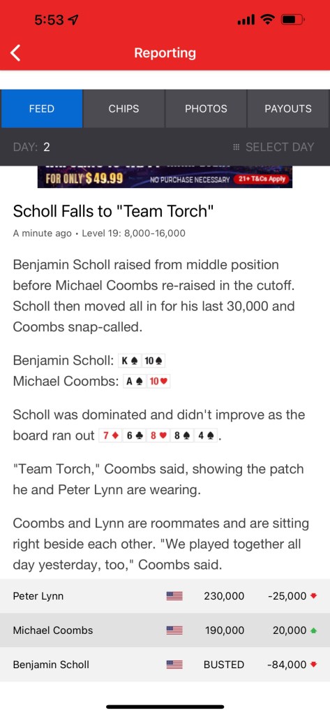 My rise continued after the break and I rather comfortably made the money and when the bubble burst, I found myself sitting on an average stack, in position to actually make a deep run. Plus, Joker and I were getting some coverage from PokerNews.