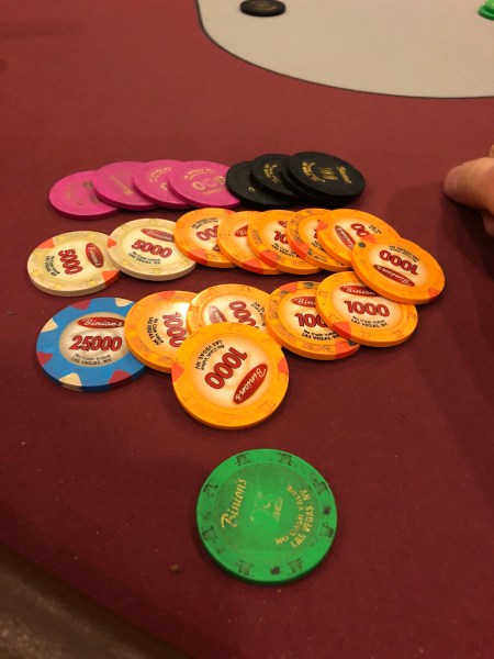 After four levels, I had built my starting stack up to 13.5K and I had it up to 18K during level five before losing with AA to J7 (!) and falling back down to 12.5K. By the 500/1000/100 level with the money bubble in sight, I was sitting on a 27K stack and playing poker with Cate Hall for the first time. I won’t go as far as to call Cate unlikable, but in this sample size of one encounter, she’s been one of the least friendly famous pros I’ve played with. She stared daggers at her opponents, had big headphones on, and I don’t think she said a word to anyone, except to ask for a chip count. In fact, I three bet jammed on her once with AK suited and had my chips in perfect stacks of 20 and totally visible, as easy to count as possible, and she still asked me how much I started the hand with. I had to resist the urge to burst out laughing at how comical that was. I’m not saying that everyone that has had success and becomes recognizable has to be an ambassador for the game and always be approachable and friendly, but I do think it’s a better table presence than being stone-faced and quiet all day. Shrug.
