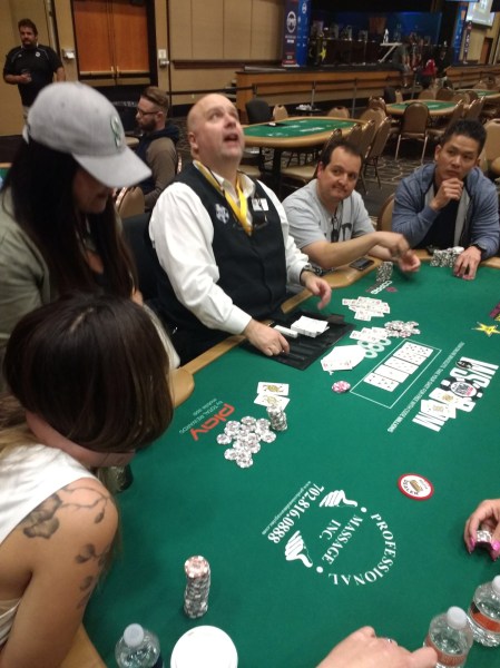 Day 2 started with 175 players and 111 of us would cash. I started Day 2 with 60% of the chips I started it with last year and I got a good taste of how bad I punted when I cruised to the money with ease this year. I’m not suggesting I played that big pot poorly and I would probably take the same line again, but it’s pretty clear that pot was the reason I didn’t cash last year. I was a little below average when the money bubble burst, but I had 62K after scooping a well known pro in a hand I thought was a little weird. I defended my big blind heads up with Q532 and check-called a bet on an A65 flop. I turned a Q and decided to lead out and my opponent called. The river was another A and since I expected my opponent to have one most of the time when he opened-raised from middle position, I checked and planned to call, hoping to get half. He did bet and I was pretty shocked when he turned over a naked 43 low and I got the scoop. I lost a big pot in limit hold em when the button opened and I three bet KK from the small blind and Don Zewin four bet from the big blind. The three of us saw an Ace high flop and, having no history with Zewin, I just check-called it down and he showed me TT, which turned a set. Having played with Zewin now and watching him play on the live stream of a later final table, I would have at least folded the river because he’s actually a pretty huge nit.
