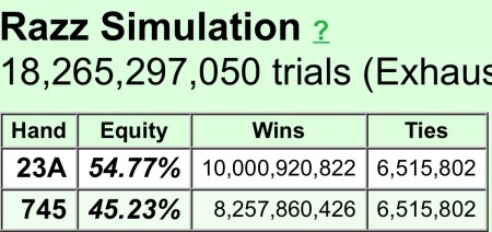 Let’s imagine a Razz hand. Someone opens with a 5 up and you look down at A2-3. For simplicity sake, let’s assume all cards are live. Pretend your opponent has 34-5. How big of a favorite do you think you are?