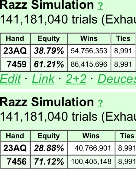 I’m not really sure how this should affect my strategy in a big bet structure, but against a large field of inexperienced and unpredictable players, I don’t think pushing small edges is going to be ideal. If someone opens and you 3-bet, they are unlikely to fold and look how big of an impact 4th street has on the equities: