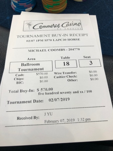 Honestly, I was skipping this event. I love HORSE. It’s my favorite game. But I don’t love no limit. I prefer limit structures, for all sorts of reasons, but mostly because I’m way better at them. Also, this tournament starts at 4 PM on a Saturday. Considering what I can make in a cash game on a weekend night (more on that later), why would I want to fire in a $350 tournament that starts late and might even last two days?
