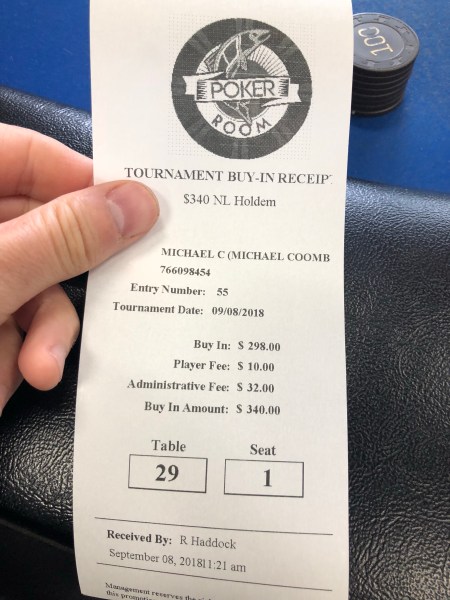 3:54 PM: So frustrated. I’ve won three pots in almost five hours. It’s super hard to do well in poker tournaments if you never win a hand. The guy on my left is absolutely murdering me. He’s beat me in no less than six pots. Every time I open he has a hand and I’m yet to beat him in a hand. It’s so frequent and predictable at this point it makes me think he’s picking on me but the showdowns I’ve seen have been AK, AK suited, and AA. I think he’s just running good and my timing is amazingly atrocious.