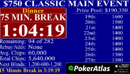 2:27 PM: 8 levels down. 131 remaining of 274 runners. I have 20k coming back to 400/800 and average stack is 25k.