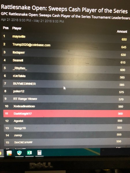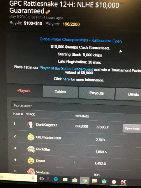 In other words, the payouts are brutally flat. There is a bigger jump from 9th to 8th than from 7th to 6th and all the jumps are pretty insignificant until four players left. At this point, I am going to be disappointed with anything less than 4th place, I think.