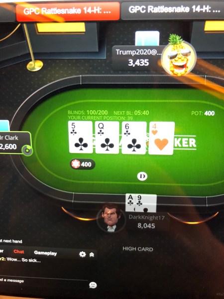 Blinds 100/200, I open to 500 with A9 of spades and only the big blind defends. Flop is 762 with two spades and the big blind check-calls 500. The turn pairs the 2 and I decide to keep barreling and bet 1200. He calls again. Sigh. I guess I have to get there. Oh, hello 3 of spades! He checks and I have 5500 and really think if he has anything he’s going to call jam, so I stuff and he does call… with 75o and I double up to 15.5K. We’re healthy again!