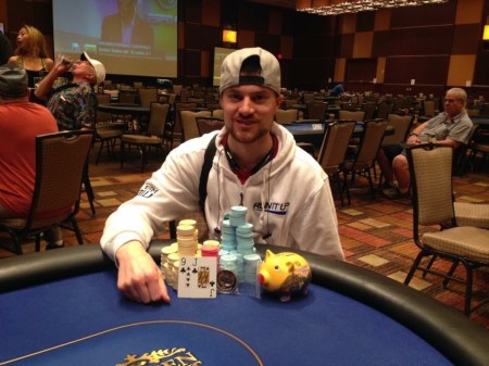 My key hand at the final table came against a player I would later identify as Michael Trivett, a guy that has a live tournament resume that resembles my own, but I thought acted like a total asshat after this pot. We were in stud hi and I had buried aces with an 8 up first to act after the bring in. With a couple of higher door cards behind me I decided to limp in and disguise the strength of my hand, but everyone ended up folding anyway and I was heads up against Michael. I took the betting lead on fourth street and continued to fire unimproved on 5th street when Michael check-raised me showing three wheel cards. He could definitely have a straight here, but my hand was way too underrepped to considering folding, plus I had a three flush working. On 6th street I caught another flush card and he caught a high card to take the board lead and bet out again. I decided that raising 6th street was a reasonable play since he was unlikely to reraise a straight when I was repping a flush and I thought I had at least 7-9 outs to a flush (can’t remember if any flush cards were dead) and possibly up to 14 more outs to trips or better – and if I missed, I could just take the free showdown. 6th street went as planned and I caught two pair on 7th and decided to go for value. He paid me off and my hand was good – and he really kind of lost it. I mean it wasn’t a total meltdown, but he was cussing at me and saying things like “that’s what happens when you get too cute,” which is a bizarre thing to say to someone after losing a pot. I kept his weak range in the pot, took an aggressive line on 6th street, and then realized my perceived equity by getting there on 7th and took him to value town… and he cried about it like a baby. He started the table with the chip lead and had a really cocky holier-than-thou vibe going on, so I was pretty happy to see him fizzle out in 6th place after this pot. Obviously this hand helped catapult me to the final two and I really thought I was going to pull off another outright win, but after my opponent pulled even with me for a second time and offered a chop, I relented and split the remaining prize pool with him.
